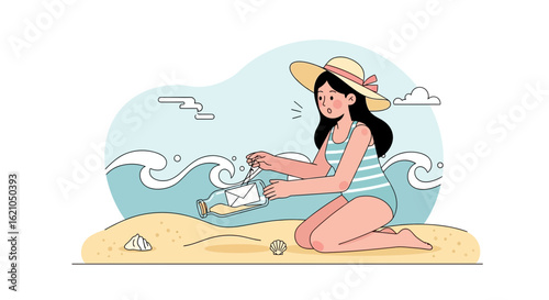 Young woman wearing swimsuit ad sun hat applying sunscreen, flat vector illustration. Sunblock, sun protection cream. Summer beach skin care routine.
