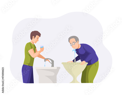 Care for old senior people. Woman bring tea to old person vector illustration. Personal assistance on retirement. Nursing home, volunteering and charity service