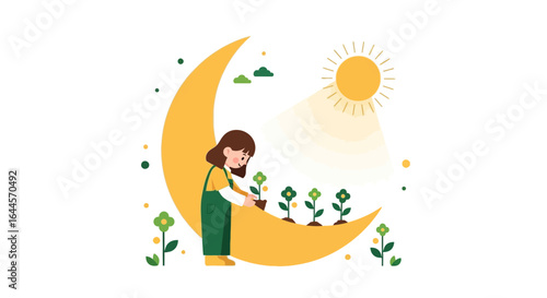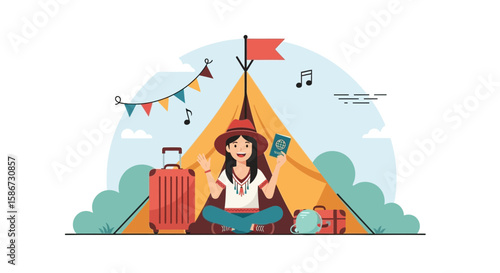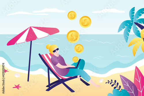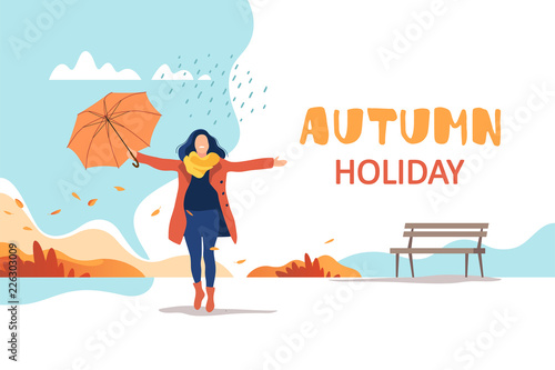 Woman choose christmas tree in a forest. Winter season vector concept illustration. Girl drinks hot wine and sit on a swing in a park.Web site design template.