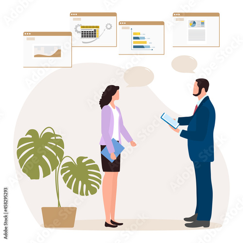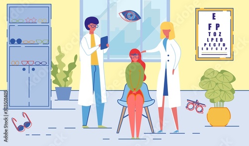 Woman customer at eyeglasses shop choosing and buying drops for eyes or contact lens liquid on showcase vector illustration. At ophthalmology store concept