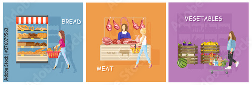 Woman florist caring for plants, working in greenhouse, making flower bouquet vector illustration. Promotion banner, flyer, card or cover template set