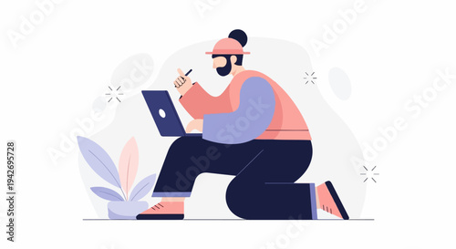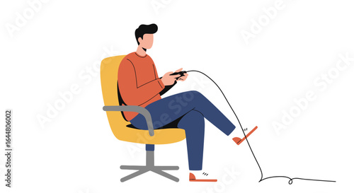 Man in headphones listening to audio programs on tablet computer, flat vector illustration. Male character listening to music, radio, podcast, audiobook. Podcasting, online radio, streaming.