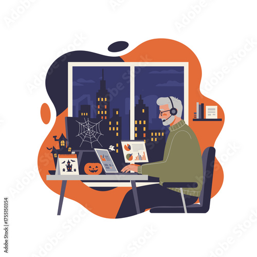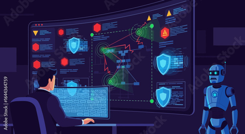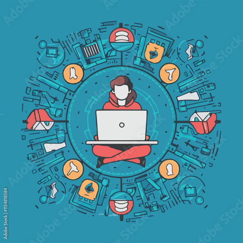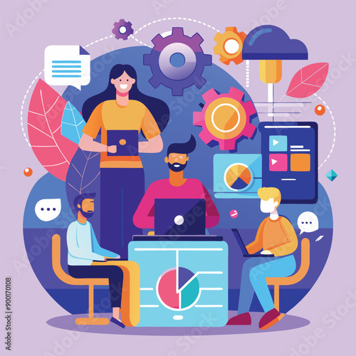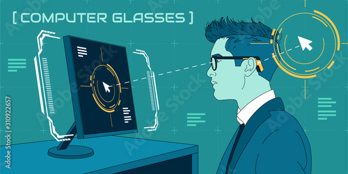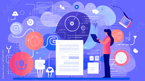 Woman in wheelchair works with virtual reality screens. Female engineer and data analytic. Diversity and Break the science bias concept vector illustration. Women in tech. Innovative technologies.