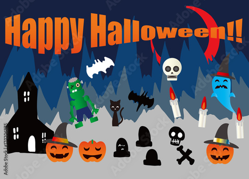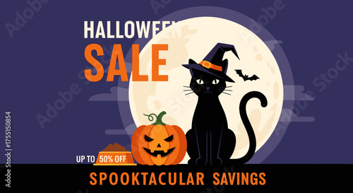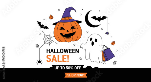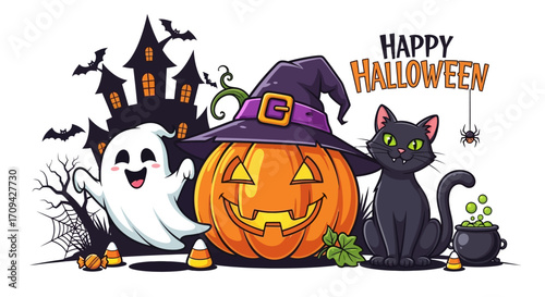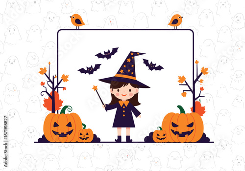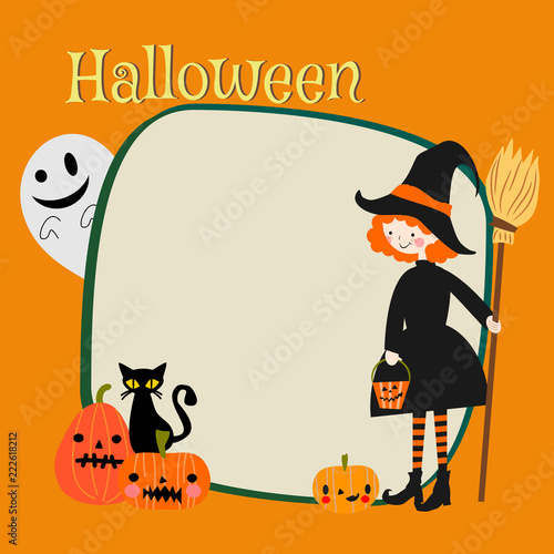 Woman in witch halloween costume going to night club. Halloween party celebration. Vector illustration. Pumpkin decoration.