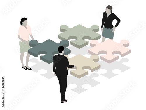 Woman, man couple and jigsaw puzzle pieces vector. Business people problem in partnership and human hand connect bridge between partner illustration. Relationship psychology concept