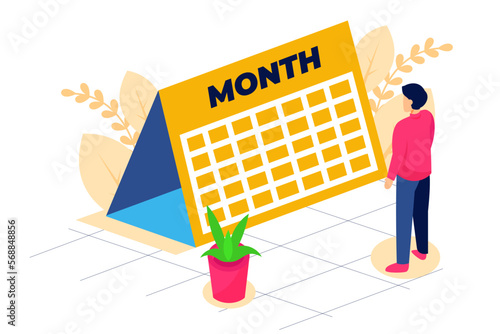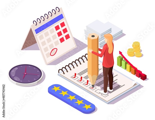 Woman marking checklist, tasks as completed, flat vector isometric illustration. Productivity, punctuality, task management concept.