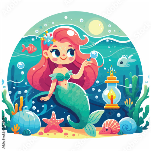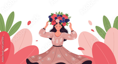 Woman meditating in nature, flat vector illustration. Girl sitting in lotus yoga position. Mindfulness, relaxation, calmness, zen, harmony.