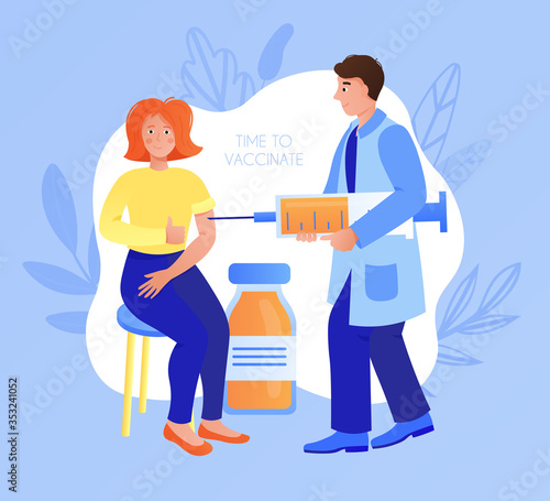 Young happy woman patient getting orange vitamin intravenous injection in clinic vector illustration. Female sitting in chair and doctor bringing new portion of supplement. Medical and beauty concept