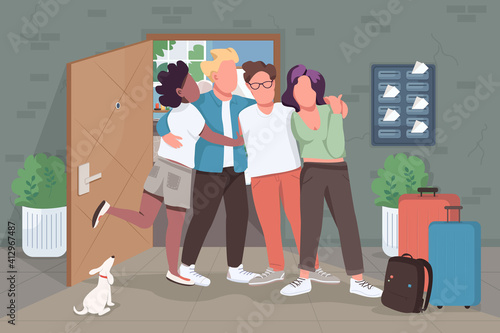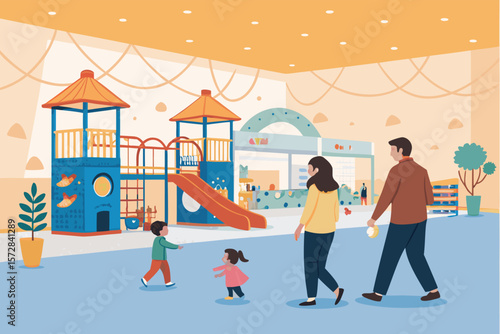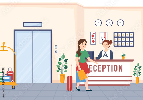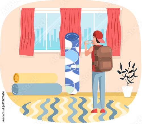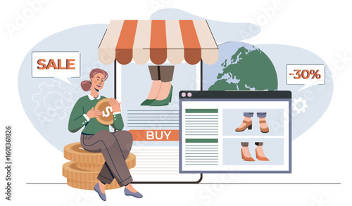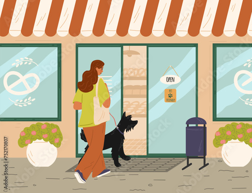 Woman pet owner with puppy visiting bakery or pastry shop scene. Dog-friendly environment vector illustration