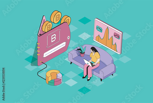 Young woman playing dance arcade game, flat vector isometric illustration. Game club, room, zone attractions, fun activities, entertainment. Arcade gaming.
