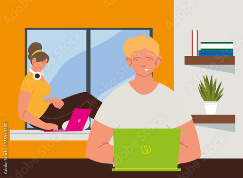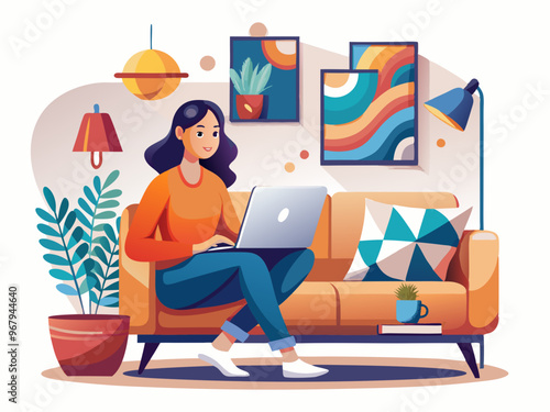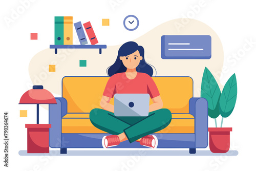Woman reading book on sofa while vacuum cleaner domestic robot clean a room. Robotics technology concept vector illustration.