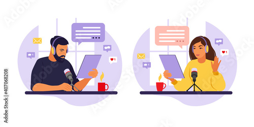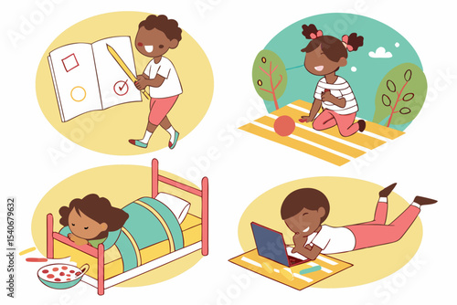 Young woman reading book while sitting, standing, lying at home and outside. Vector illustration in flat style.