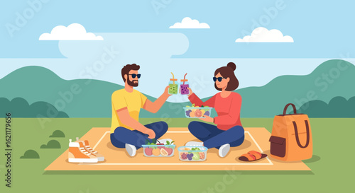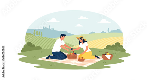 Woman siting on a blanket and reading book with mountain landscape on background. Summer outdoor picnic concept illustration. Vector web site design template. Weekend and vacation, outdoor travel.