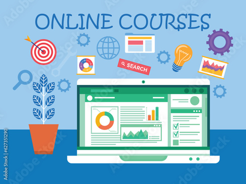 Woman sitting in chair and working with laptop from home. Laptop with financial charts and alarm clock on a desk. Home office and business concept illustration. Vector web site design template.