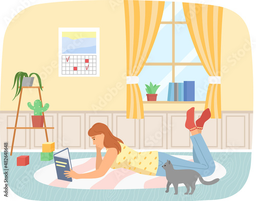 Woman suffering from low temperature at home sitting on bedside in bedroom trembling and shaking body under blanket plaid scene vector illustration