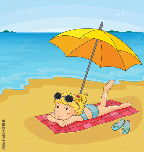 Young woman sunbathing on beach applying sunscreen flat cartoon vector illustration. Girl caring for skin while resting at resort seaside. Beauty and health concept