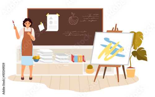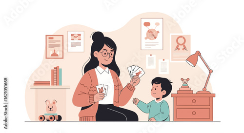 Woman teach her son abc. Home school concept illustration. Vector web site design template. Mother play with kid at home.