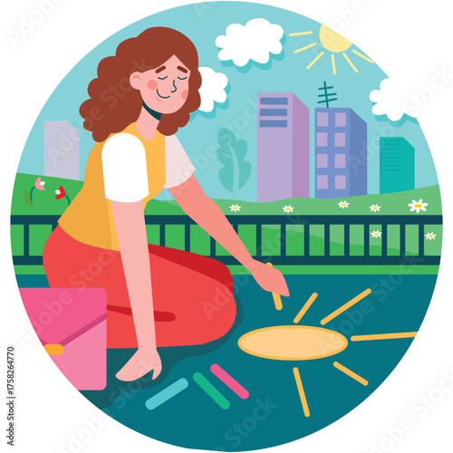Woman uses chalk to draw sun on asphalt road. Woman enjoying her beach vacation and reading book. Weekend and relax time concept illustration. Vector web site design template.