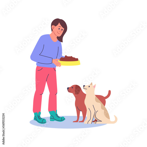 Woman walking dog and picking up pet waste vector illustration. Female character throwing canine poop in special bag into trash can isolated on white background