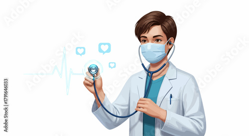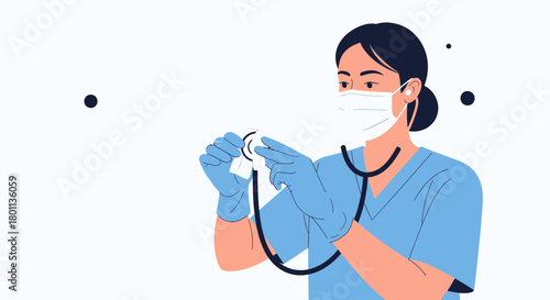Woman wearing medical mask using hand sanitizer vector icon isolated on white background