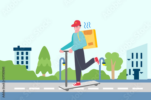 Woman with a dog walks by cafe with glass door. People drink coffee in restaurant, concept vector illustration. Cafe owner greets customers in front of his shop.