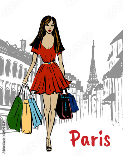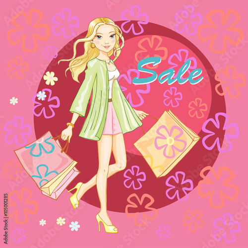 Woman with bags shopping. Vector illustration in comics pop art style. Special sale offers advertising poster.