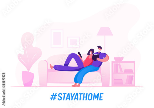 Woman with tablet sit on couch at home. Girl put coin in piggy money box. Money saving concept illustration. Vector web site design template.