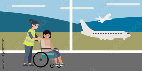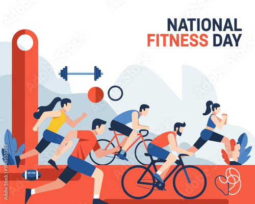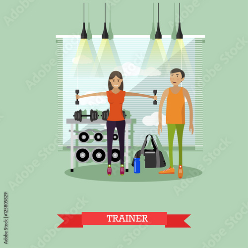 Woman working out on exercise bike in fitness center. Girl in gym vector poster.