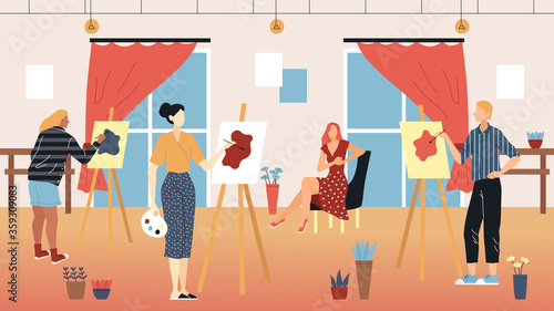 Atelier scene with dressmakers, fashion designers and customers, flat vector illustration. Female characters choosing fabric, trying on dress. Sewing workshop, studio interior. Tailoring business.