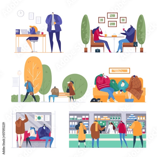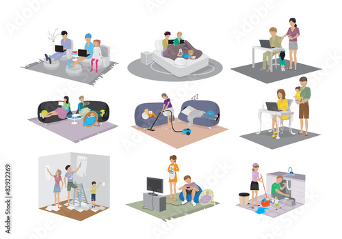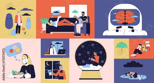 Fitness people cartoon character set, flat vector illustration. Girls doing kangoo, pilates, stretching, tae bo fitness exercises, riding stationary bike. Gym workout. Active and healthy lifestyle.