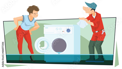 Women wash clothes in washing machine. Vector illustration in flat style.