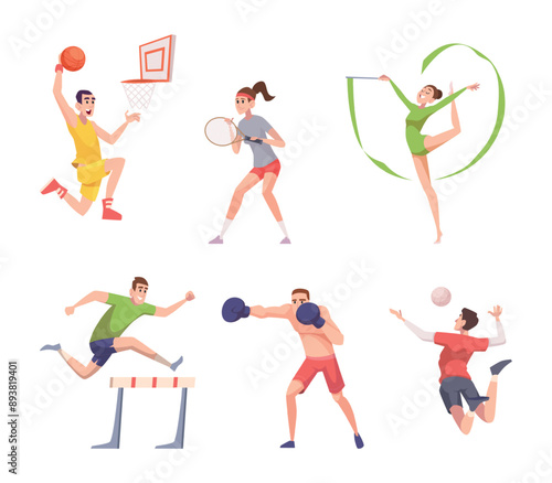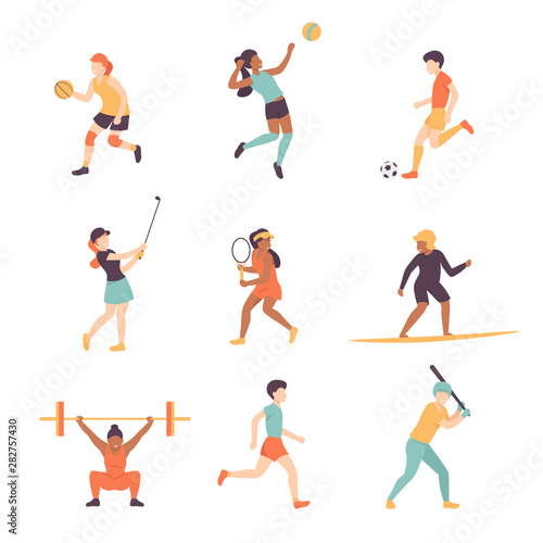 Women's lacrosse players control the ball, characters vector set. Female lacrosse players isolated figures with ball and stick.