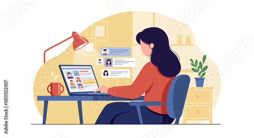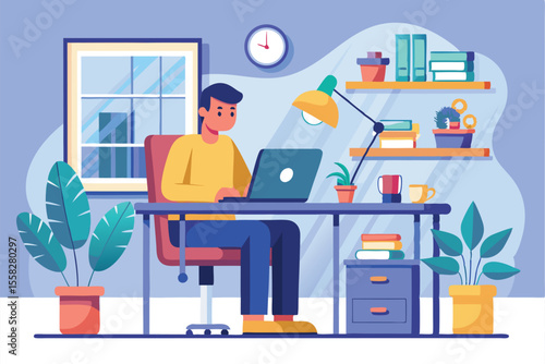 Overworked tired office man sitting at table in front of computer with head reclined upon his hand, vector flat illustration. Work burnout, mental fatigue, emotional exhaustion, work related stress.