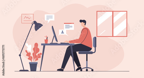 Tiny female characters working from home using laptop computer and internet connection, vector flat illustration. Remote work, freelance, home office.
