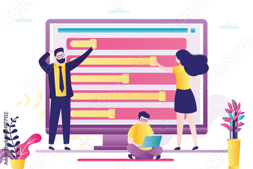 Vector illustration of big laptop and tiny people monitoring statistical dashboard, holding light bulb, shouting through megaphone. Business workflow process concept for web banner, website page etc.