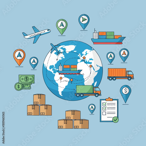 Worldwide delivery concept vector flat illustration. Computer with world map and location pin on monitor, drone delivering parcel, truck, globe, handshake. Delivery service poster, banner.