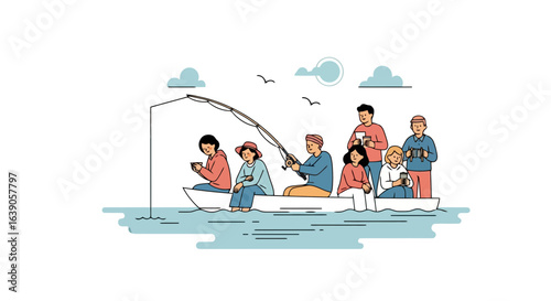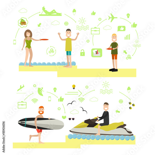 Happy male and female characters taking boat trip, vector illustration. Young people jumping in water, sunbathing on deck and drinking champagne. Yacht travel, summer vacation, sea cruise concept.