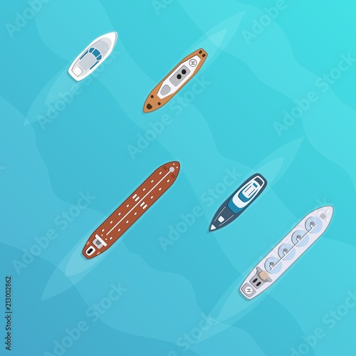 Yachts and boats for travel over sea or ocean water surface aerial eye view vector illustration. Summer vacation, romantic cruise and aquatic leisure activity concept