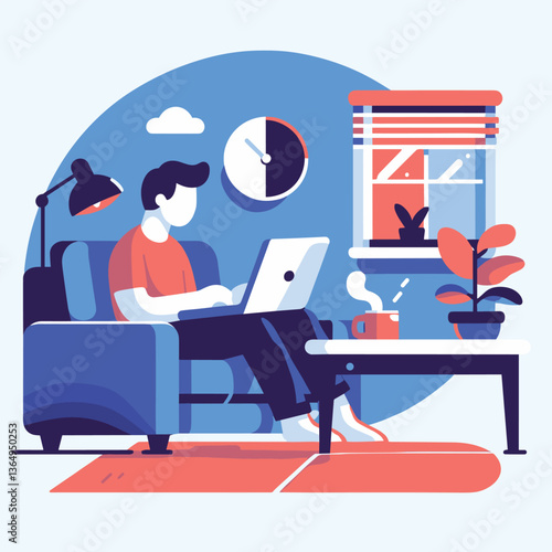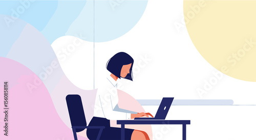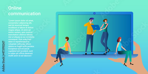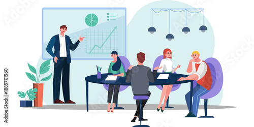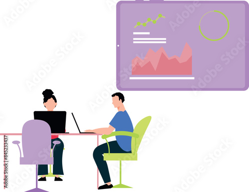 Business people man and woman doing warrior 1 office yoga poses at work together with online coach, vector flat style design illustration. Online coaching, yoga and meditation in office concept.