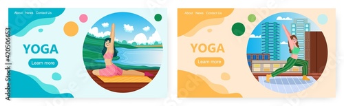 Yoga landing page design, website banner template set, flat vector illustration. People enjoying home, outdoor yoga classes, doing stretching exercises. Wellness, healthy life, mind and body practice.