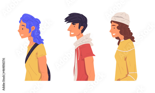 Young adult teenage students cartoon characters wearing casual attire standing isolated on white background. Set of male and female teenagers with different studying accessories