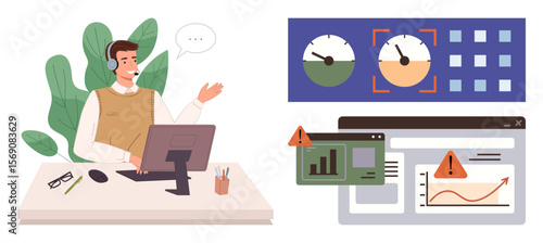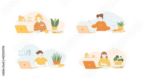 Young and senior women sitting on their beds with laptop computers, flat vector illustration. Bedroom interior, female characters working remotely from home, chatting, surfing the net, studying online