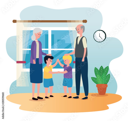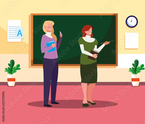 Young man choosing picture for purchase, flat vector illustration. Woman showing painting, piece of art to customer. Upgrading living room of apartment, house for comfort. Home improvement.