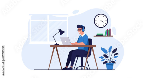 Young man in headphones speaking into the microphone in front of laptop computer, flat vector illustration. Dj creating podcast, hosting live radio show in studio. Podcasting, online radio station.