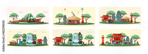 Young people enjoying scooter riding scene set. Happy man and woman using eco-friendly vehicle for transportation, travel trip adventure and doing shopping vector illustration