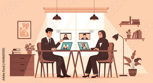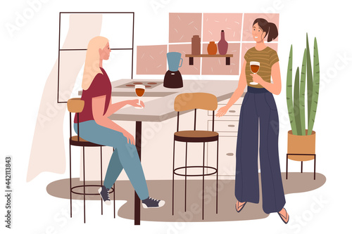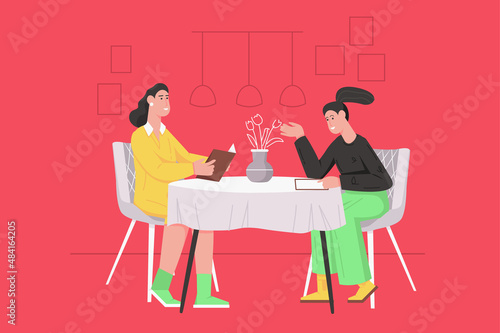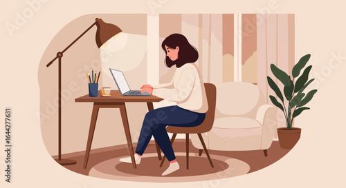 Young woman dressmaker character sewing on machine at workshop scene. Female seamstress fashion designer enjoying needlework hobby, home leisure vector illustration