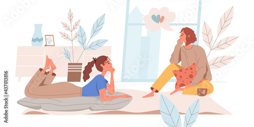Young woman friends having fun, gossiping, drinking alcoholic beverages at home pajama party before marriage vector illustration. Room interior decorated with flag garland and bridal dress in corner