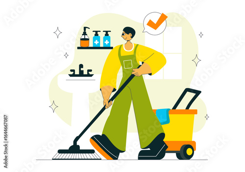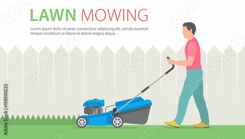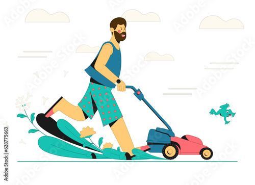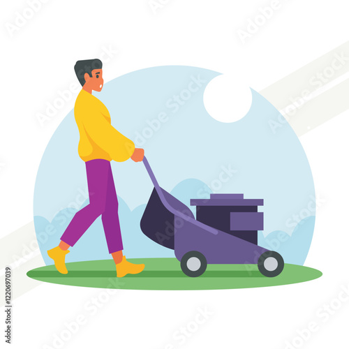 Young woman, gardener cutting grass with lawn mower, flat vector illustration. Gardening, agriculture, garden care and maintenance service.