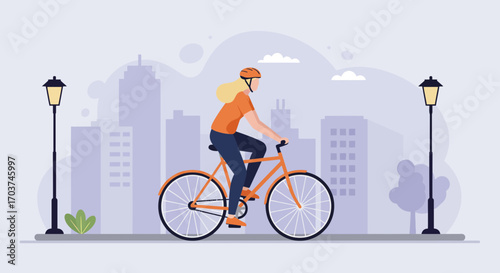 Young woman in wheelchair ride on street vector illustration. Barriers-free environment for physically challenged people. Well-equipped park area background for human with special needs