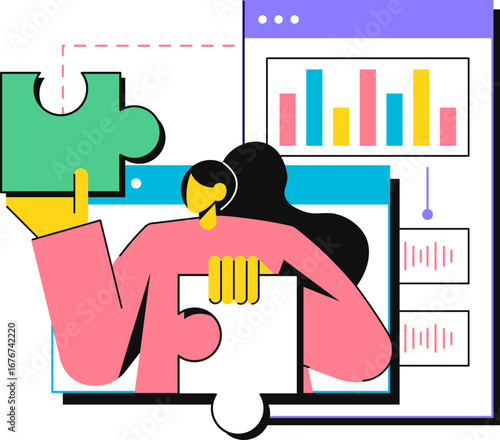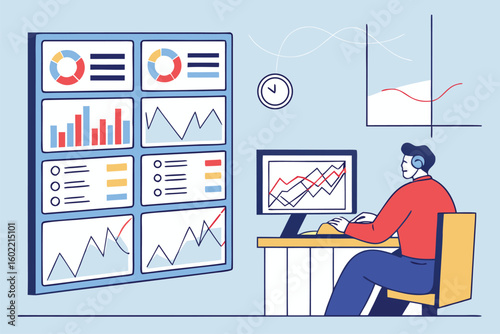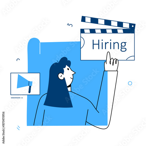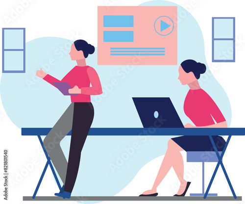 Young woman professional motion designer creating animated video making multimedia content for vlog or social media network on computer at workspace vector illustration